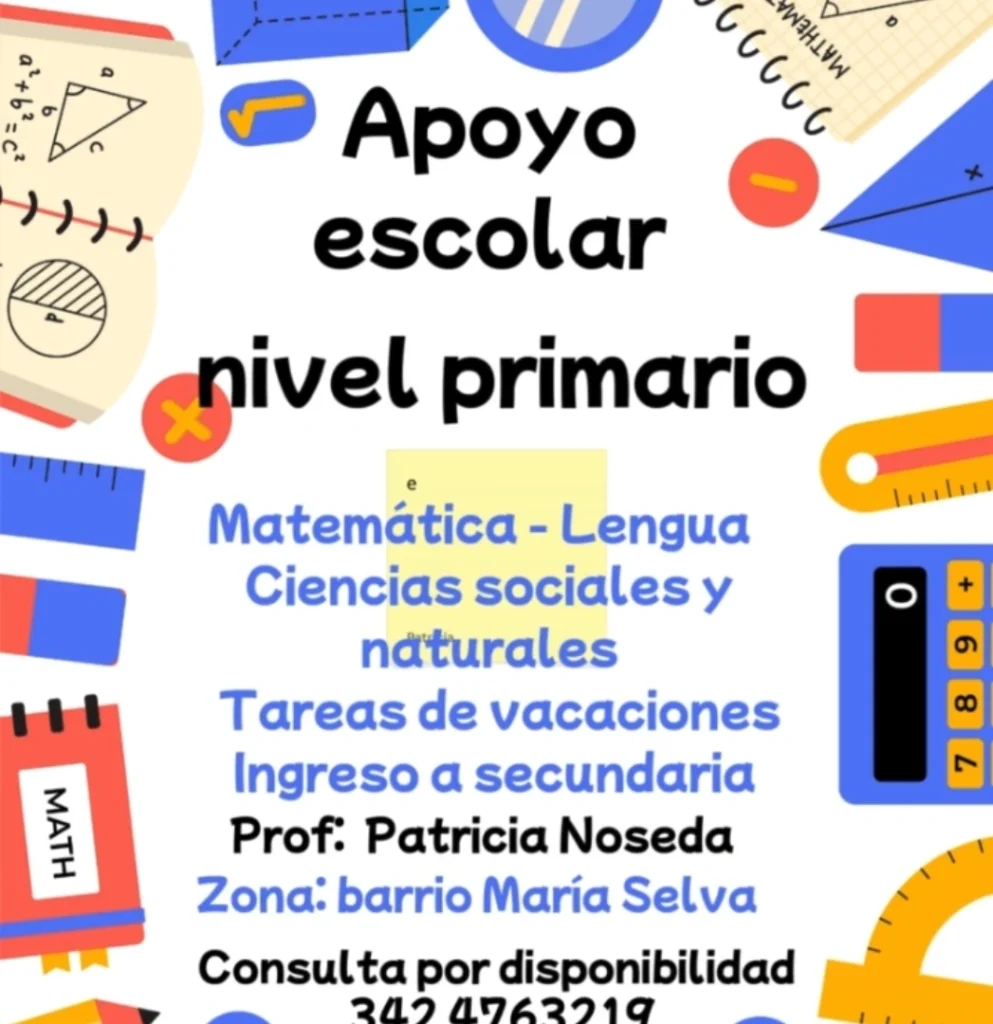 Brindo apoyo escolar de nivel primario. Tareas diarias, tareas de vacaciones, trabajos prácticos, estudio previo a evaluaciones, etc. Todas las materias. Atención personalizada con cada alumno/a. Zona María Selva. Tel 342 4763219